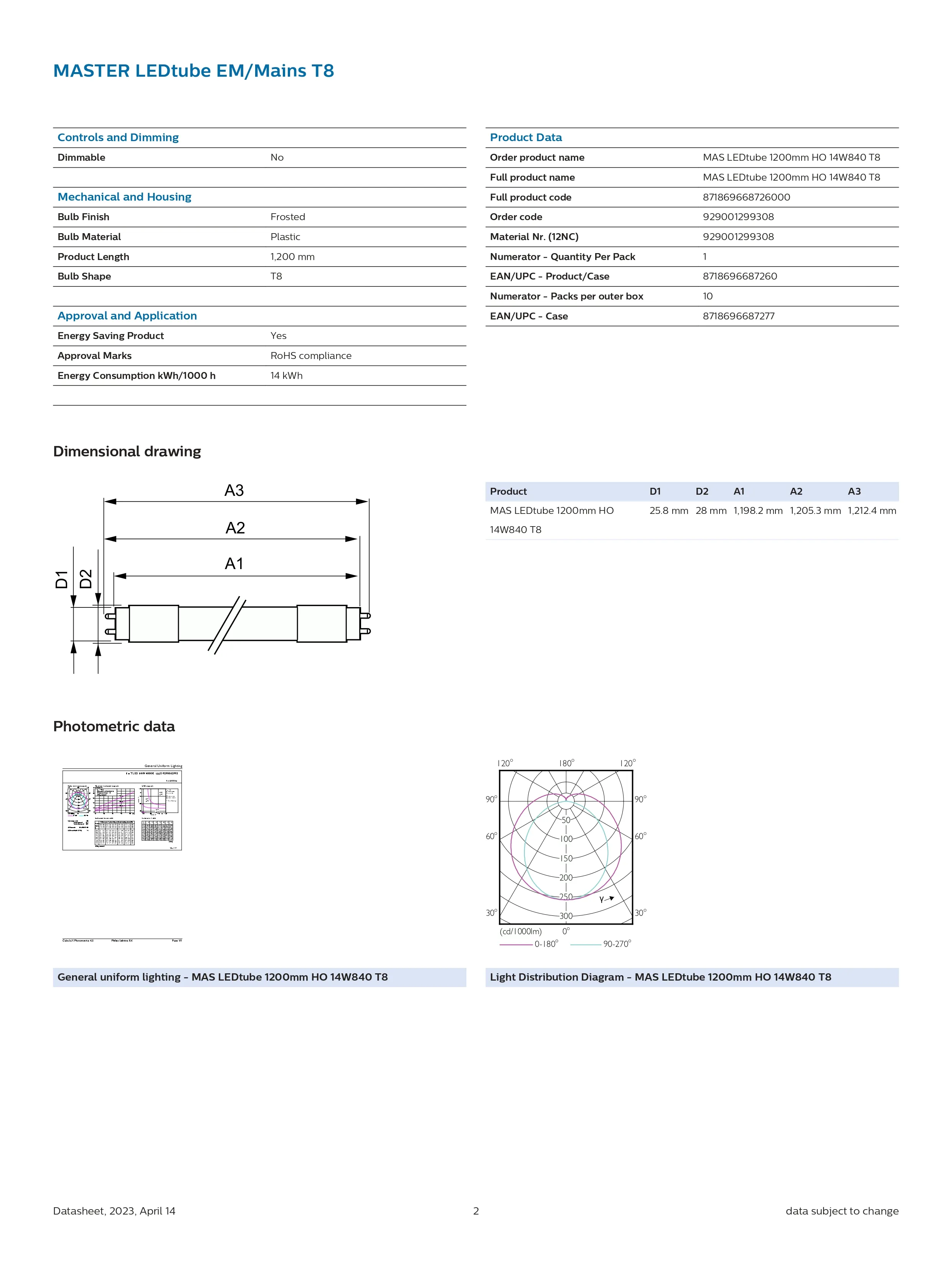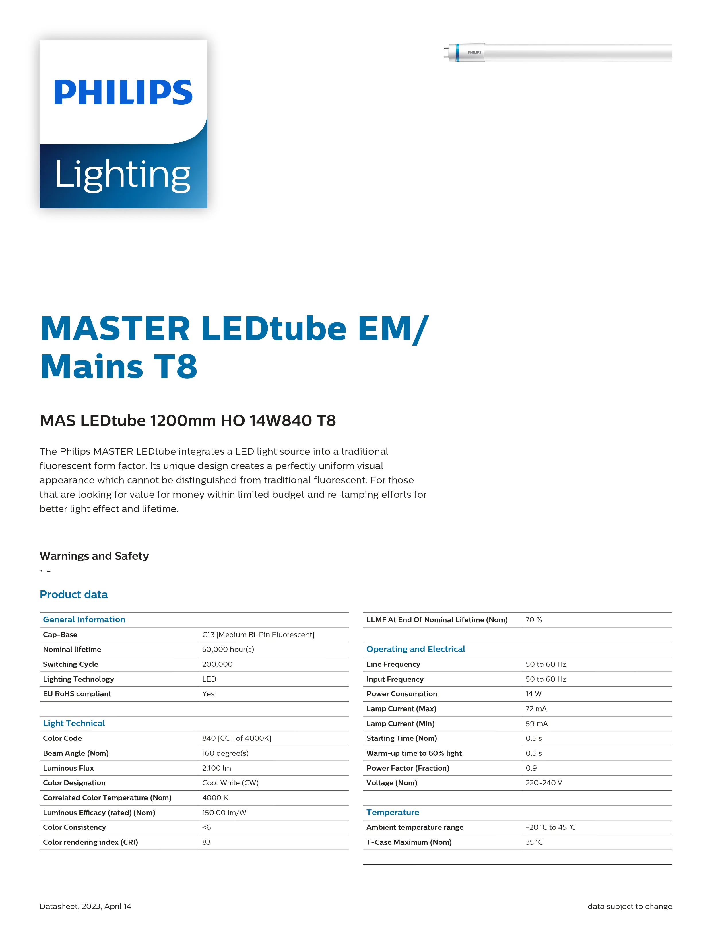 Bóng đèn tuýp led 120cm MAS LEDtube 1200mm HO 14W840 T8