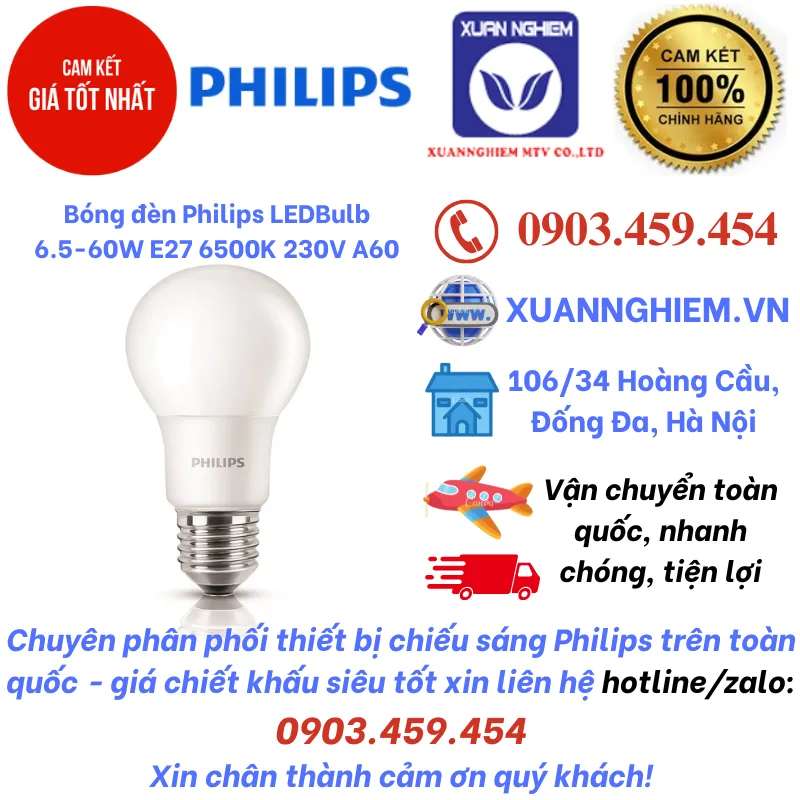 Bóng đèn Philips LEDBulb 6.5-60W E27 6500K 230V A60